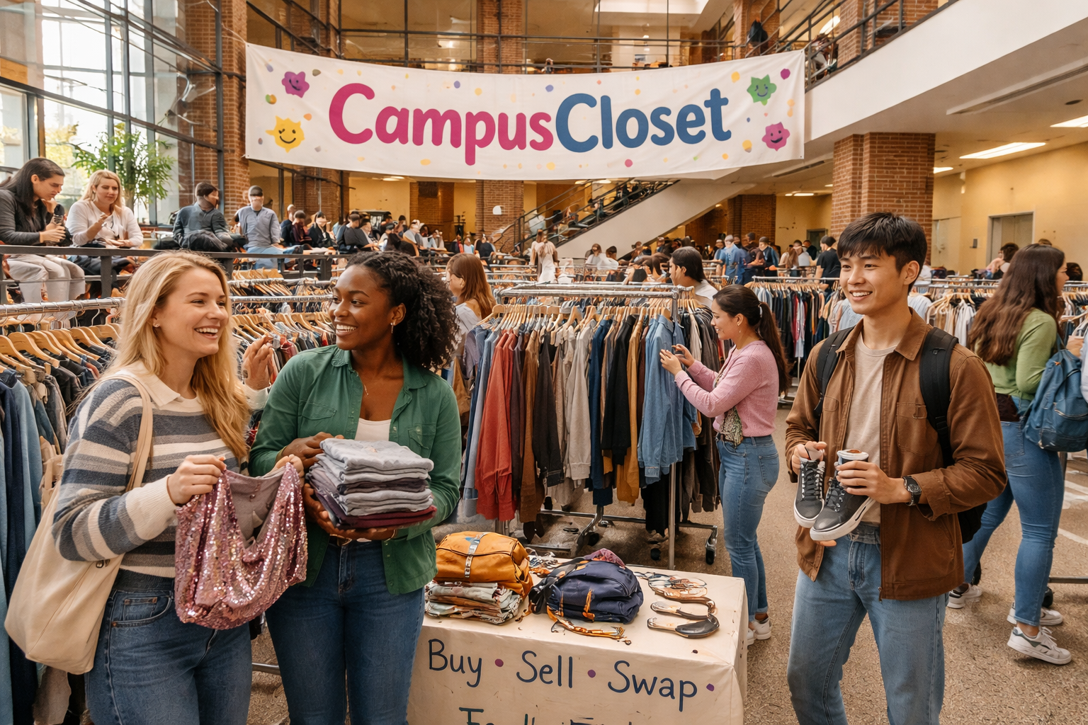 Ready to find great deals and connect with other students? Join us at Campus Closet! Here, you can buy, sell, and exchange items that you’ll love while contributing to a more sustainable lifestyle. We’re all about building a community where students help each other out. That’s also why we hold regular campus events. Let’s make smart shopping fun and eco-friendly together!